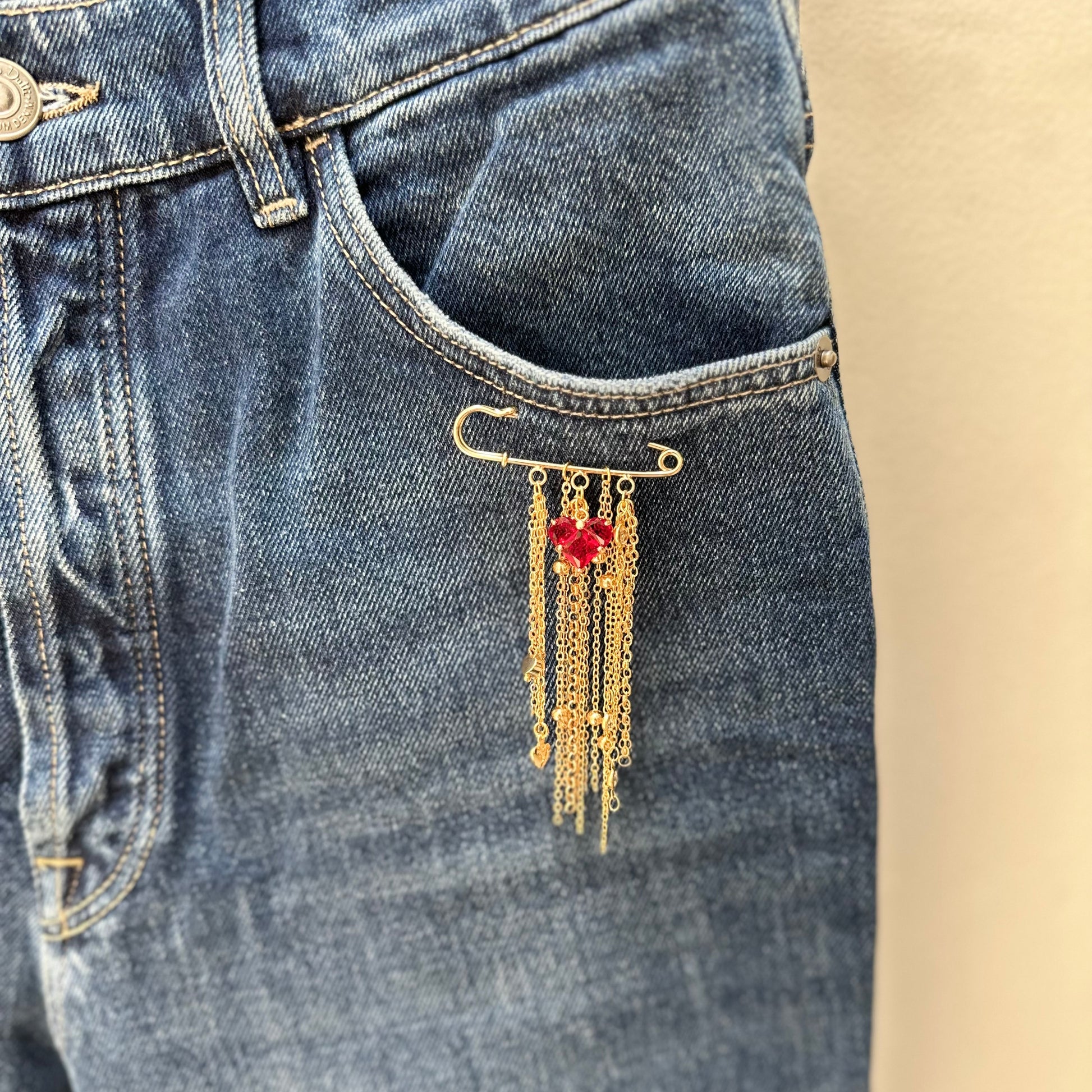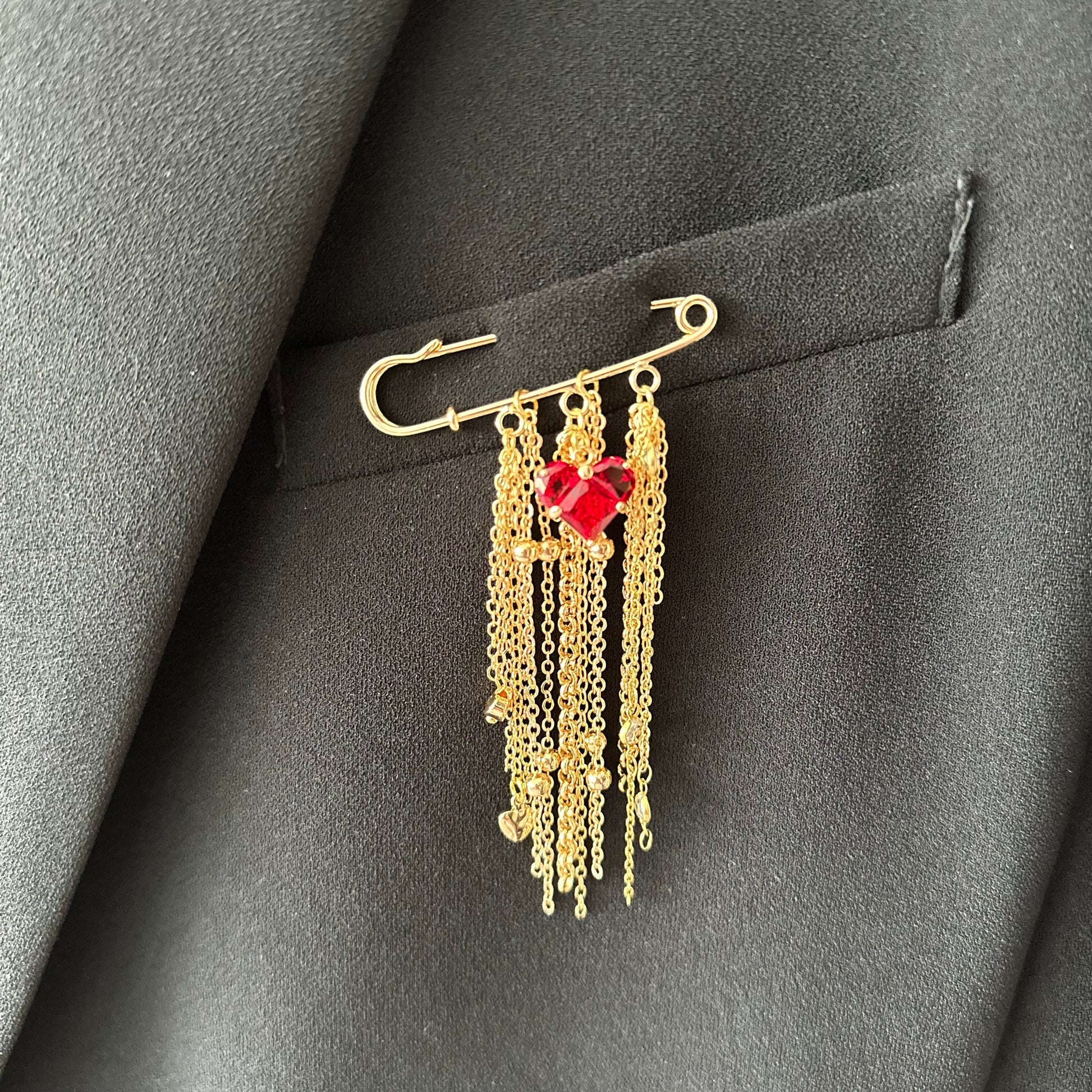 El diseño del broche presenta un hermoso corazón adornado con delicadas cadenitas que le otorgan un toque moderno y chic. Su acabado brillante resalta la belleza de la pieza, convirtiéndola en un accesorio imprescindible en tu colección.