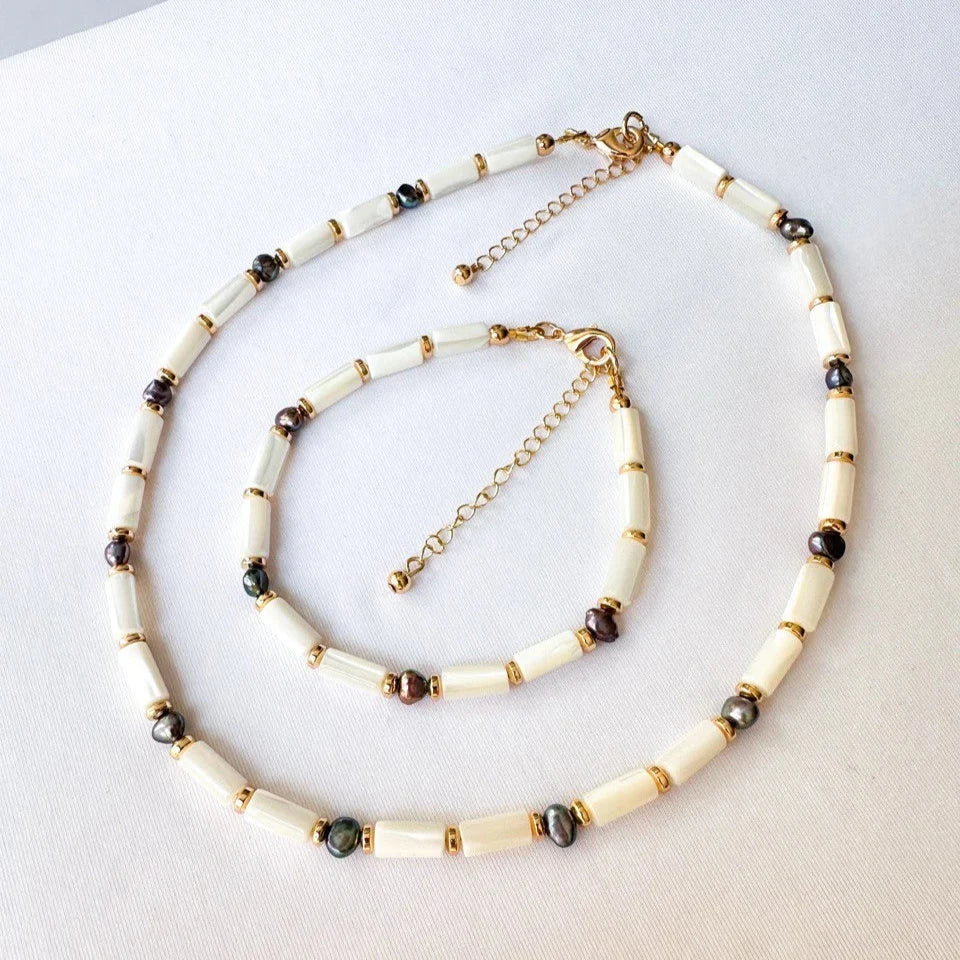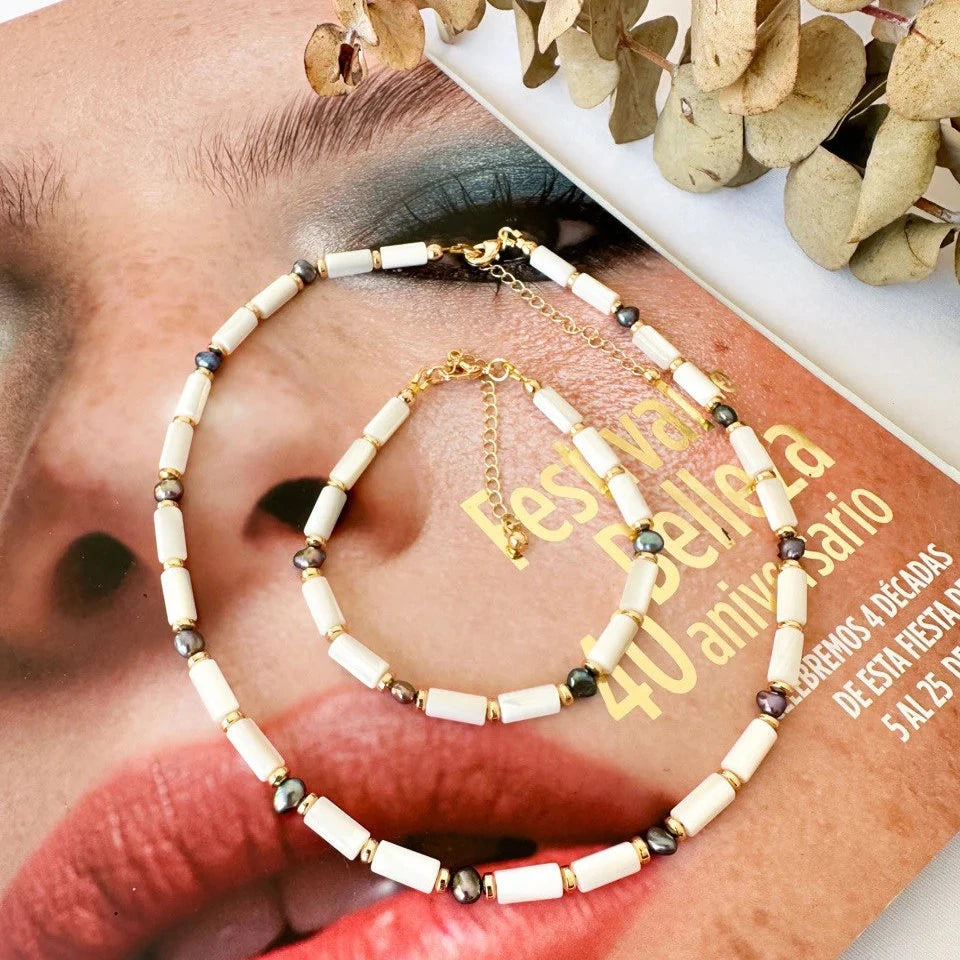 Este elegante juego de joyería incluye un collar y pulsera diseñados con tubos delicados, que aportan un toque moderno y sofisticado. Con su diseño minimalista, es ideal para quienes buscan una joya versátil que complemente cualquier look con estilo y distinción.