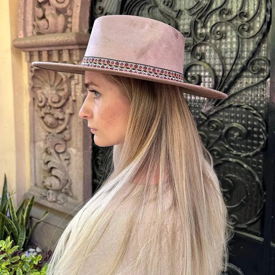 Evita el contacto con el agua y productos químicos. Guarda el sombrero en un lugar seco y protegido para mantener su forma y color.